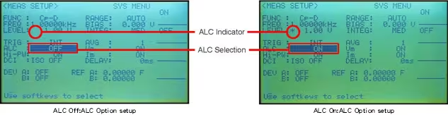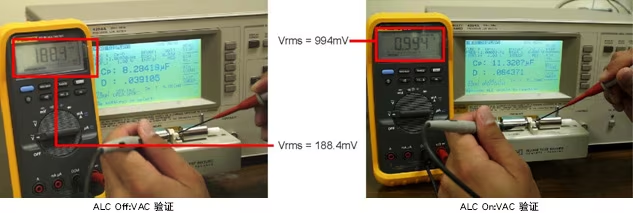 下圖展示了ALC on和off之間的差異。當ALC功能off時,電容器上的實際電壓約為1.0Vrms設定電壓的10%。當ALC功能on時,電容器上的電壓幾乎是設定電壓的100%。HP4284A具有電壓和電流等級監視器,但還是可以使用伏特計驗證實際電壓。
